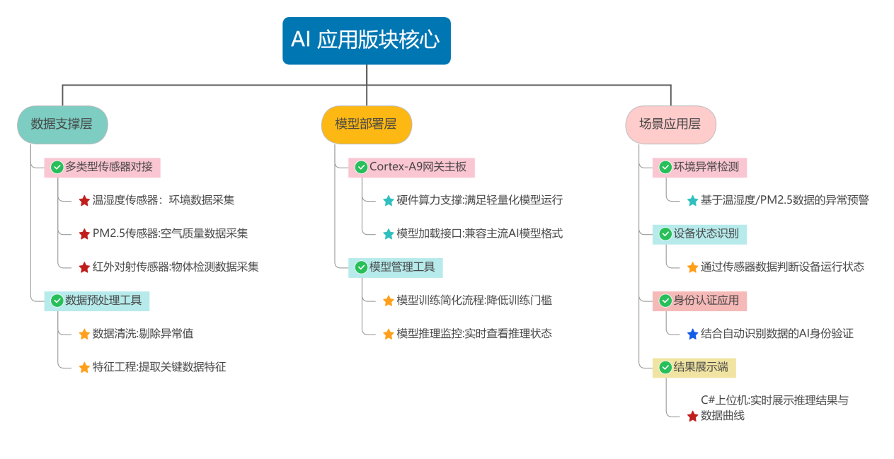 AI 学习的核心在于 “理论 + 实践” 的结合,F-Table 为 AI 应用给予了从数据采集到模型部署的全流程支持。依托平台丰富的传感器模块(如温湿度、PM2.5、红外对射传感器等),学习者可采集真实场景数据,用于机器学习数据集构建;顺利获得智能网关系列的 Cortex-A55 网关主板,可部署轻量化 AI 模型(如环境异常检测、设备状态识别等),实现 “边缘计算 + AI 推理” 的落地实践。