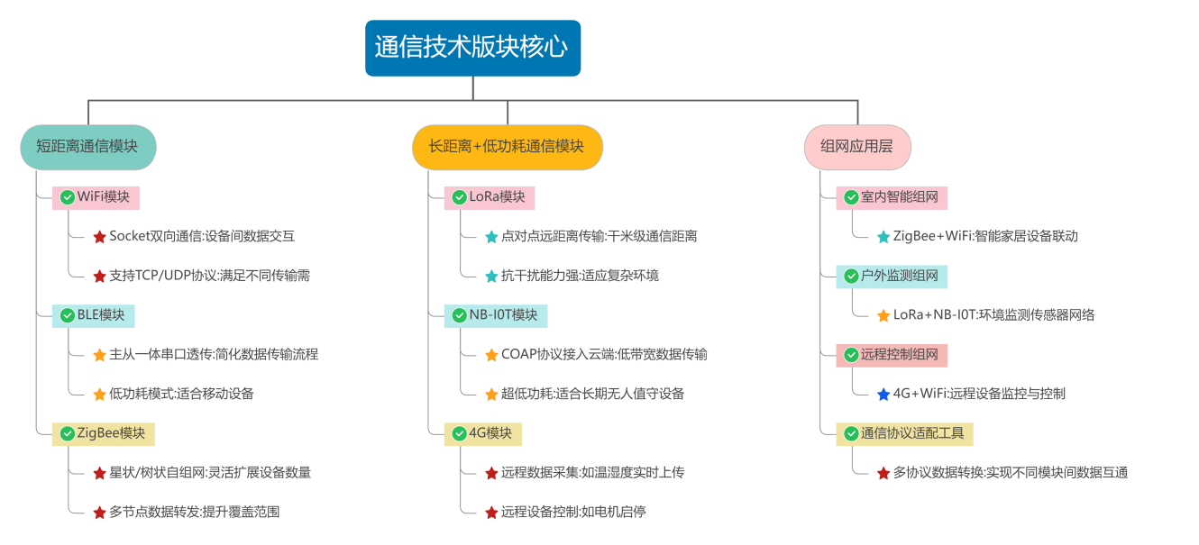 短距离通信:顺利获得 WiFi 模块实现 Socket 双向通信,BLE 模块完成主从一体串口透传,ZigBee 模块搭建星状 / 树状自组网,适用于室内智能场景(如智能家居设备联动);